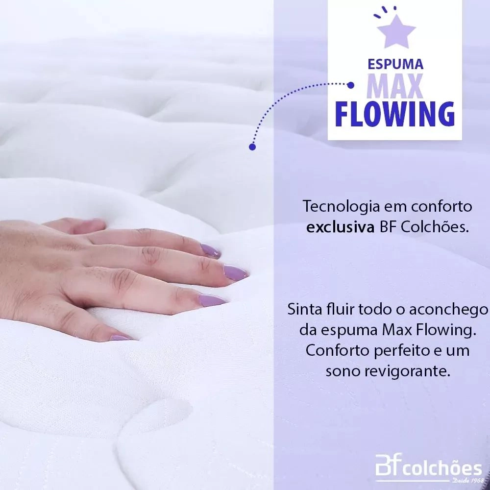 – Pillow top: Com camada de Espuma Max Flowing, tecnologia em conforto exclusiva bf Colchões, sinta fluir todo aconchego da espuma Max Flowing. Conforto perfeito e um sono revigorante.