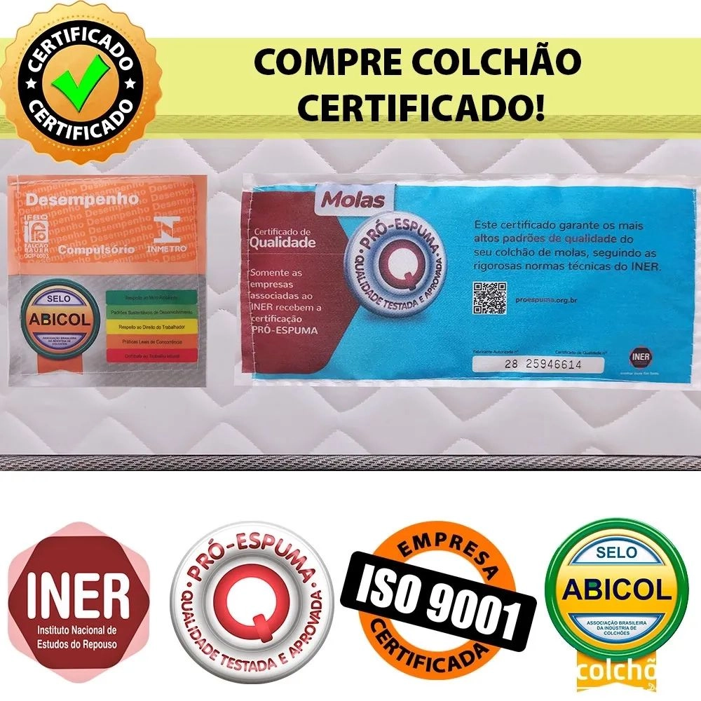 A BF Colchões possui todos, Iner- (Pró- Espuma), Inmetro, Abicol, Abnt, ISO9001. Tenha a melhor experiência com quem entende de dormir bem e preza pela qualidade e conforto do seu sono.