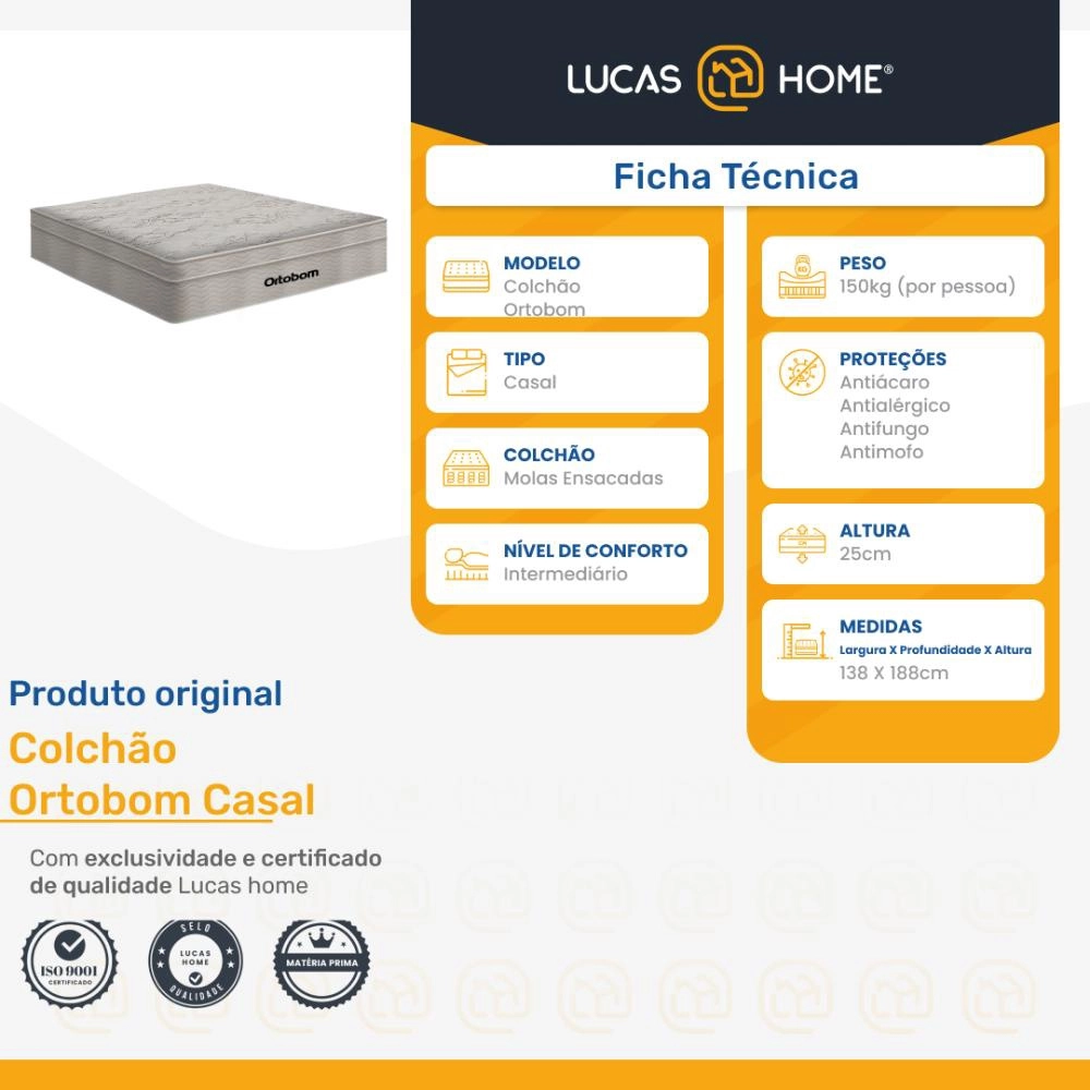 Seja bem-vindo(a) a lucas home! Uma cama só está completa se você escolher o colchão certo para seus momentos de descanso. O colchão de molas ensacadas Ortobom Airtech, ideal para o seu aconchego e bem-estar, trazendo conforto e durabilidade, garantia certificada para seu descanso e momentos de tranquilidade, além de melhorar a qualidade do seu sono. Suporta até 120kg por pessoa, e estrutura que possui tratamentos antiácaro, antimofo e antifungo para proporcionar noites tranquilas e confortáveis.