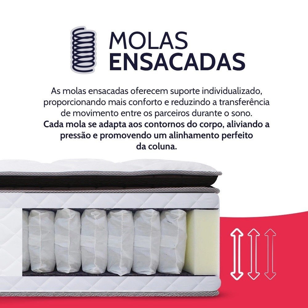 | Estrutura Colchão | Molas ensacadas individualmente: As molas se adaptam individualmente ao peso e movimento do corpo, garantindo estabilidade e absorvendo movimentos. Ou seja, quando um se mexe o outro não sente. E proporciona a sustentação do seu peso, alinhando a sua coluna. – Pillow top: Uma grande camada de Espuma Max Flowing, D-28. Macia e muito confortável, você sentira seu corpo se moldar ao colchão, proporcionando um sono restaurador. |