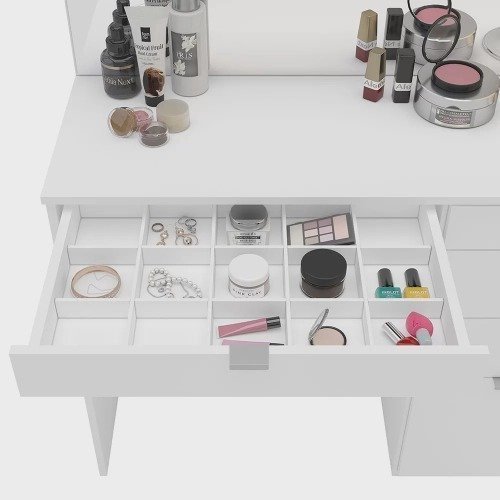 Transforme seu quarto com a elegante Penteadeira 5 Gavetas 1 Divisor Linden Politorno. Esta penteadeira é a solução perfeita para manter tudo organizado e ao seu alcance. Com um amplo espelho, você terá toda a praticidade para se arrumar com facilidade e estilo. A gaveta central é especialmente projetada com divisores para armazenar suas maquiagens e acessórios de forma organizada, tornando seu dia a dia mais prático.