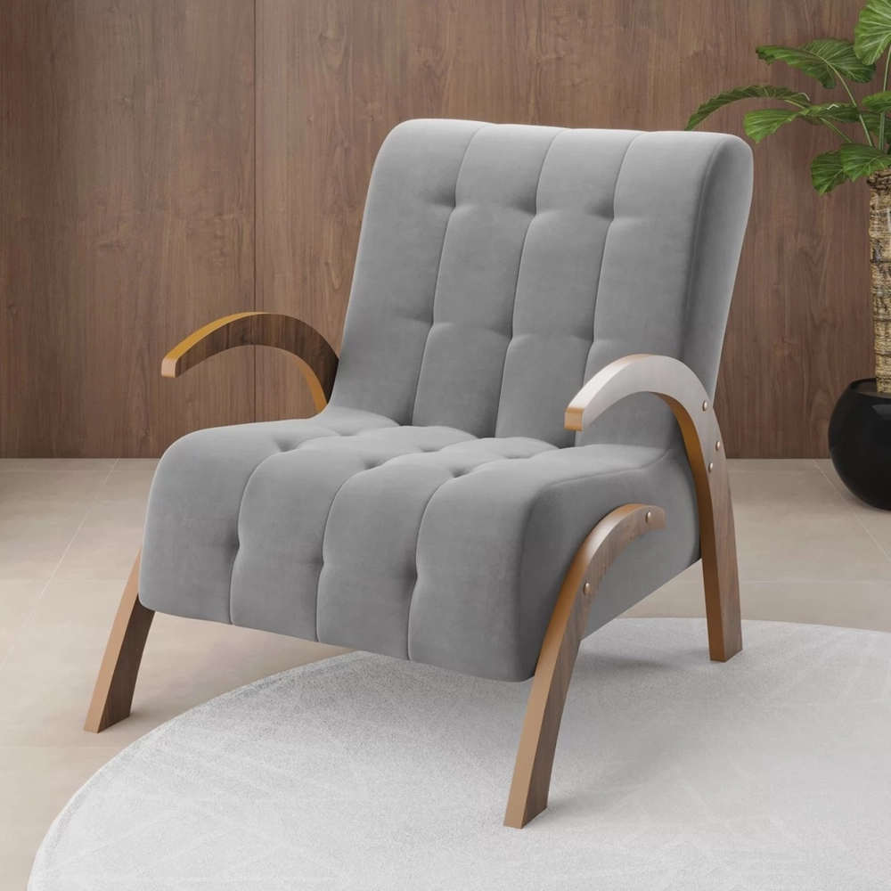 Material6221 Poltrona Estoril tem estrutura em madeira eucalipto 15 mm, possui percintas elásticas, encosto reclinável com enchimento em fibras e flocos, assento fixo com enchimento em espuma D28, pés removíveis em madeira eucalipto e revestimento em suede veludo